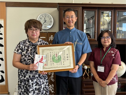 那覇市及び沖縄県の人材育成事業に活用していただきたいとの趣旨で、株式会社興洋電子様より本会の奨学金貸与事業へ10万円のご寄附をいただきました。それに伴い、那覇市教育委員会 宮里寿子教育長(本会理事)より感謝状が贈呈式されました。