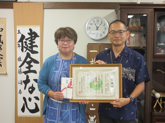 それに伴い、那覇市教育委員会 宮里寿子教育長より感謝状の贈呈式が行われました。